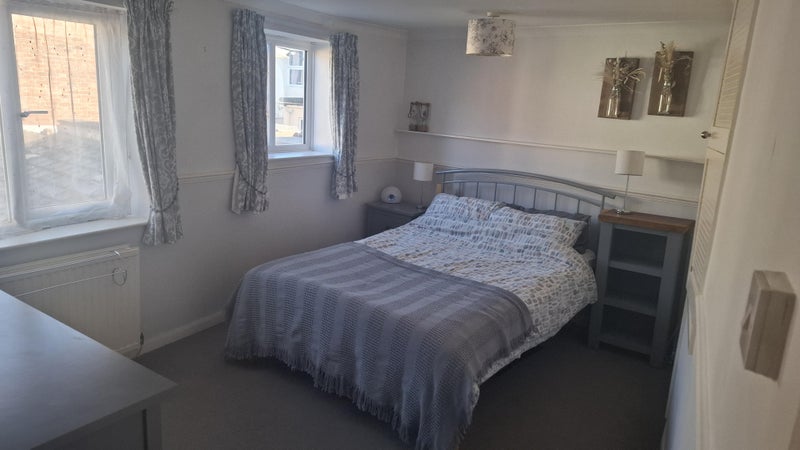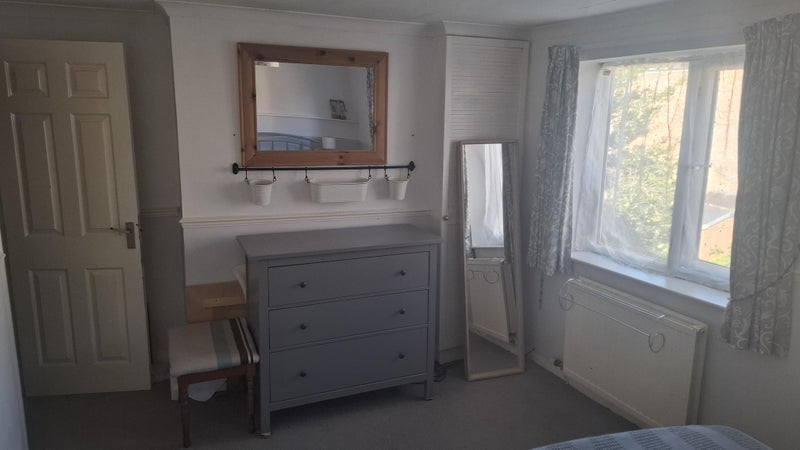 Upstairs is just the two double rooms. The room available is furnished with a very comfy double bed, with a chest of drawers, bed side table. There's lots of built-in storage - a large double wardrobe, and cupboard next to the chest of drawers.