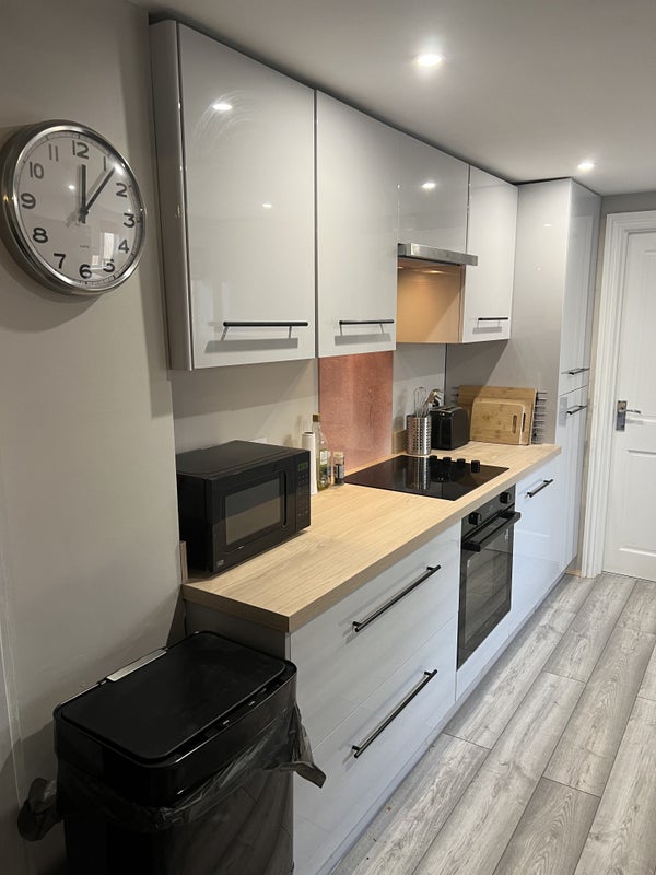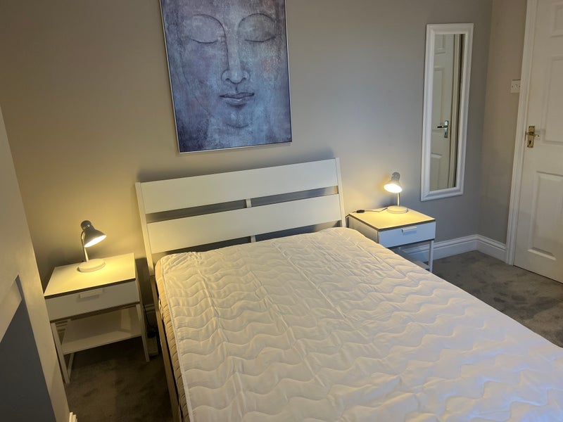 There is a lovely spacious shared lounge with two sofas, comfy chair and laptop table and chairs, also a Smart TV with free-view is provided. There are doors leading onto a lovely private back garden with garden patio furniture.