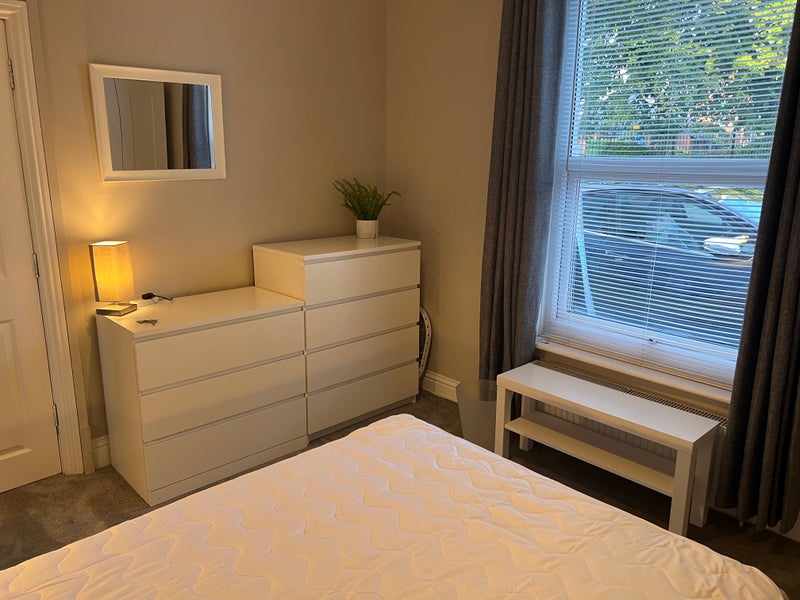The room is furnished with a double bed with under bed storage, bedside cabinets, wardrobe, two chest of drawers, small shelving unit, mirror and more...