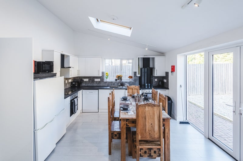 The bright open-plan kitchen, dining, and lounge area is situated at the rear of the property, opening onto a low-maintenance enclosed garden - perfect for relaxing or socialising. The kitchen is fully equipped with everything needed for easy shared living.
