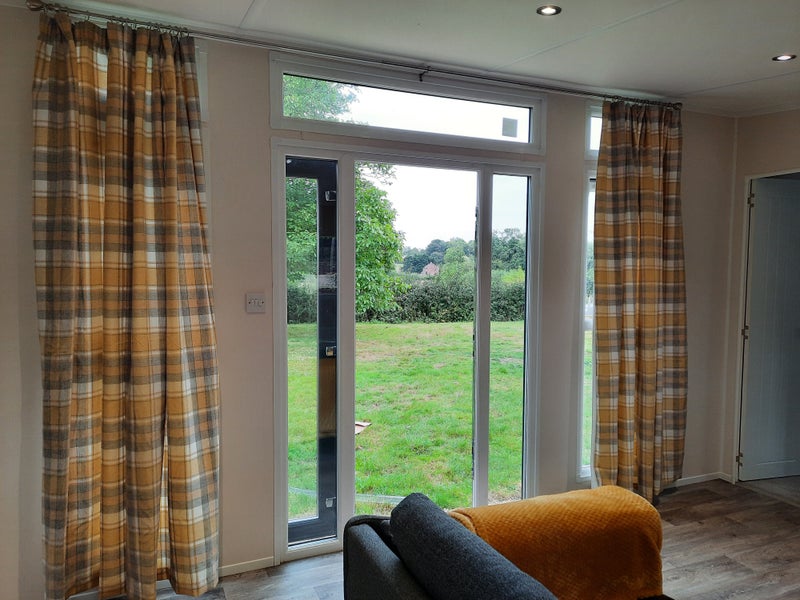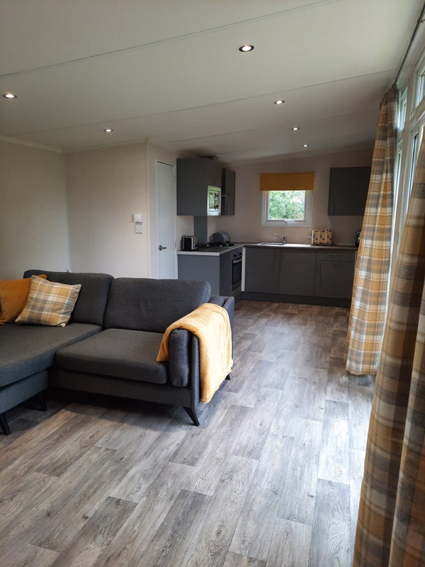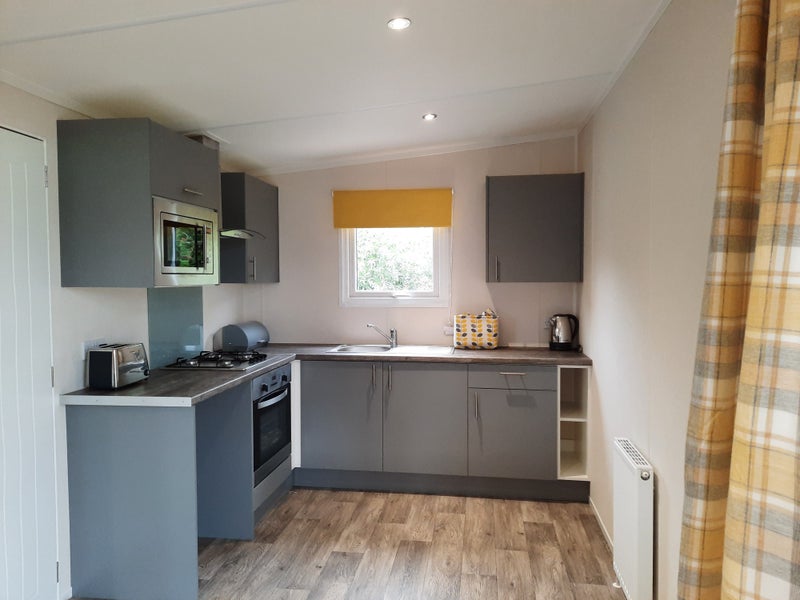 The cabin is a perfect place to stay for a professional person looking for a relaxing and comfortable base when away on business. The cabin has an open plan kitchen and lounge. The kitchen is equipped with an electric oven, gas hob, microwave and a small fridge freezer.