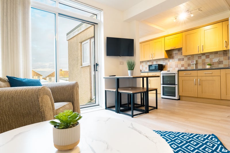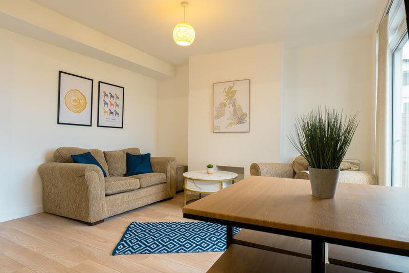 Our well-equipped modern kitchen and dining area is perfect for socializing and cooking meals. The kitchen features an electric hob and electric oven, microwave, tumble dryer, washing machine and a large fridge freezer. The communal space is finished off with sofas, a flat screen TV and a dining table.