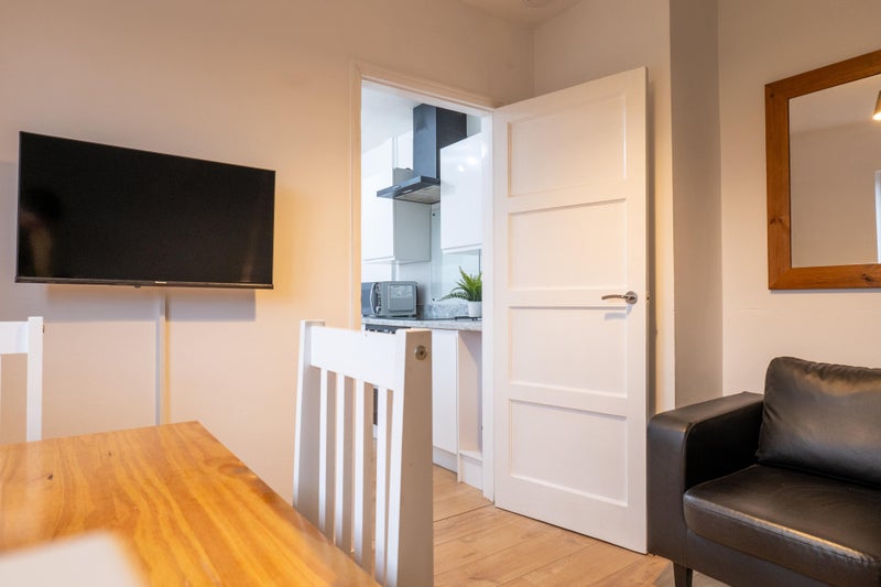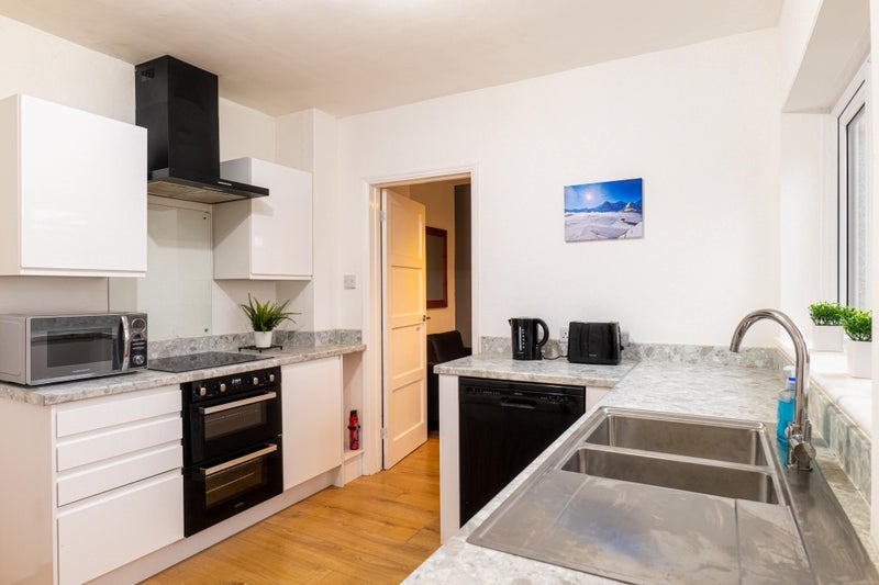The well-equipped modern kitchen and dining area is perfect for socialising and cooking meals. The kitchen is equipped with an electric oven and hobs, microwave, large fridge freezer. The living area has plenty of sofa space and a flat-screen TV.