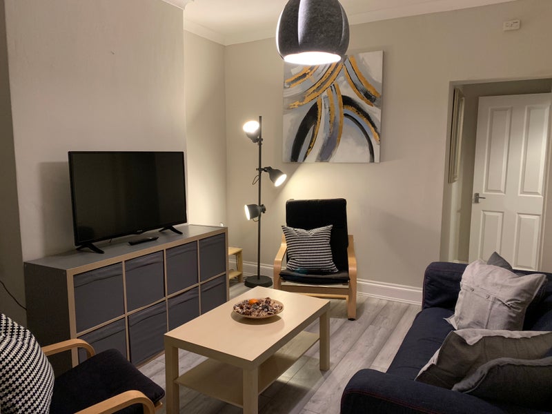The room is furnished with modern Ikea furniture, including Sml double bed, with storage underneath, bedside cabinet, a large chest of drawers, wardrobe and smart TV with Netflix.