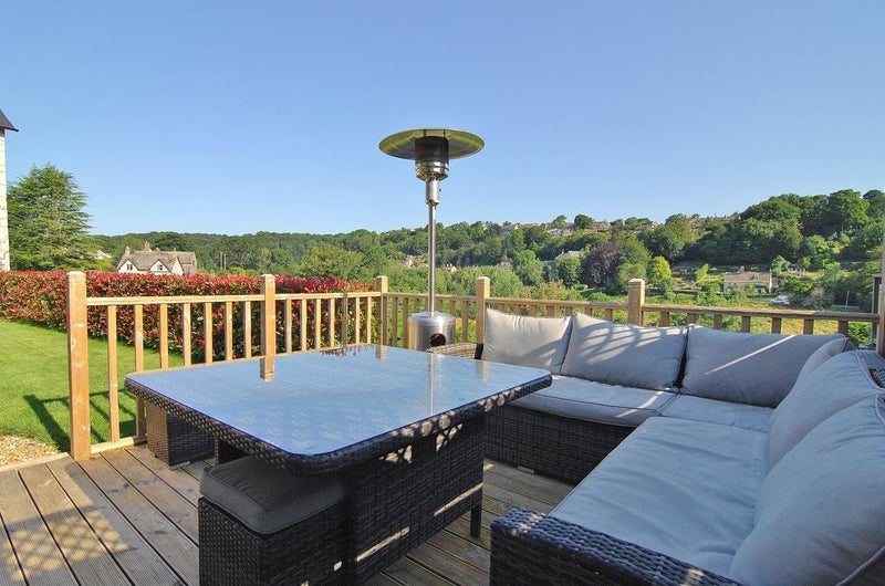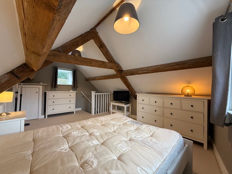 A large fully furnished double bedroom with exposed beams and views across the Shortwood Valley, Nailsworth.