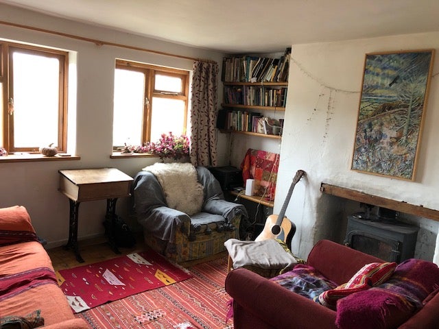 Woodstove. The house is a 1700s cottage with a garden that leads into the woods. It is on a quiet lane 10 mins cycle from Stroud centre.