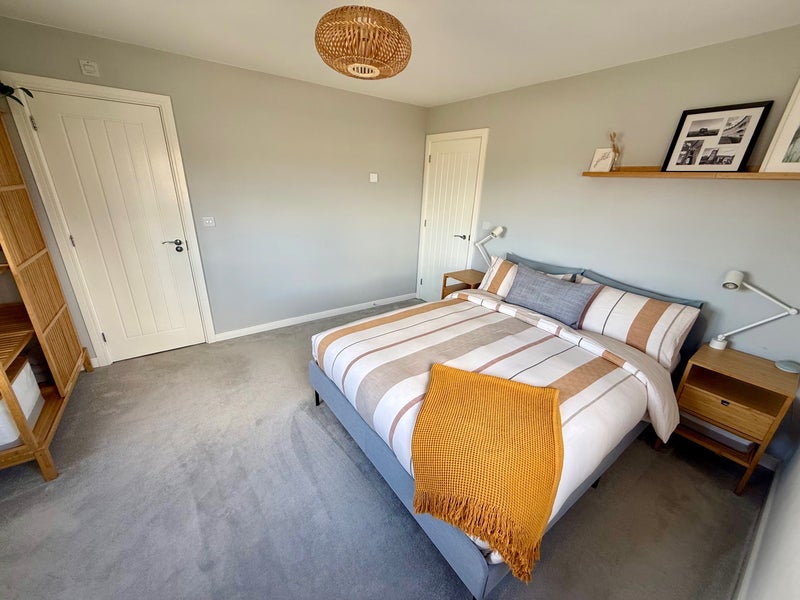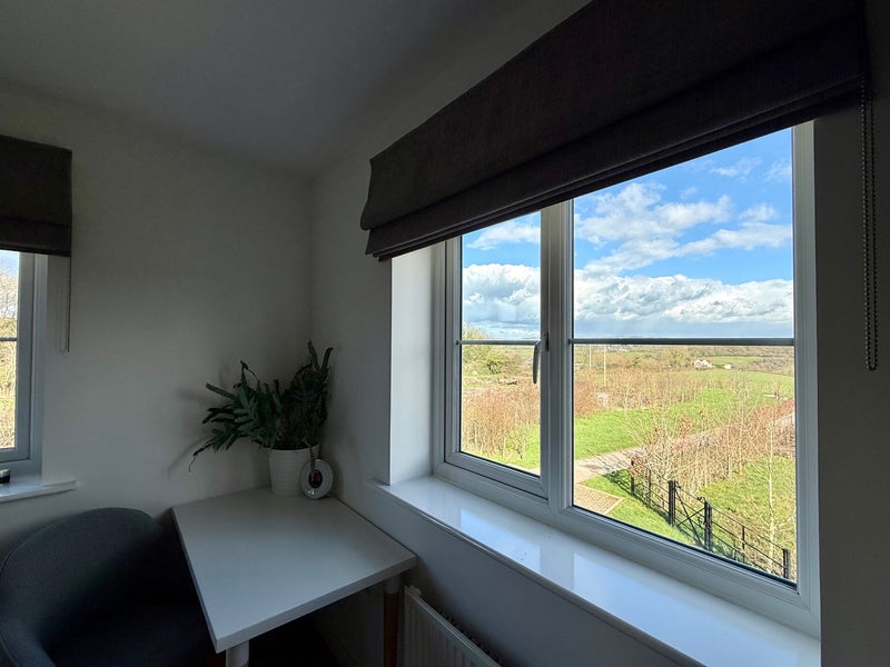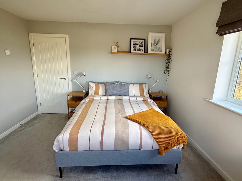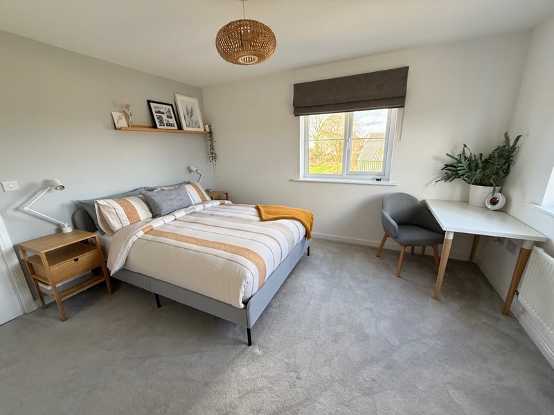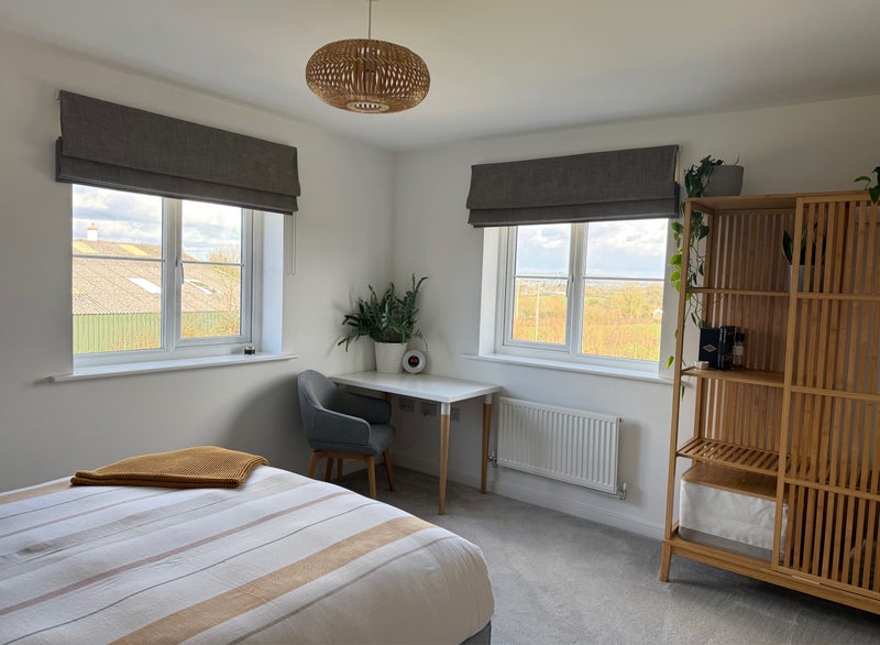 Bright and comfortable king-size furnished room available in a clean and modern home with beautiful countryside views. The room comes with a private en-suite bathroom featuring a rain-head shower, desk and chair, making it a perfect, self-contained space to relax after a long day.