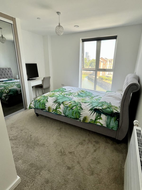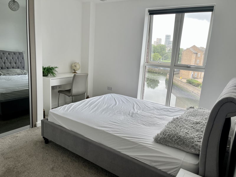 Available to rent in a spacious, modern two-bed two-bathroom flat with shared kitchen, open plan dining area/living room and a balcony. Quiet river-side flat, no traffic noise! Lovely river views from all rooms. Landscaped garden for residents only right below the flat.