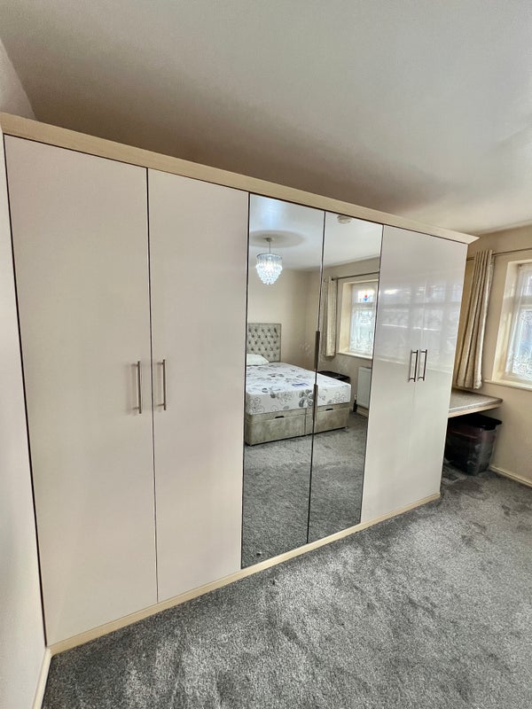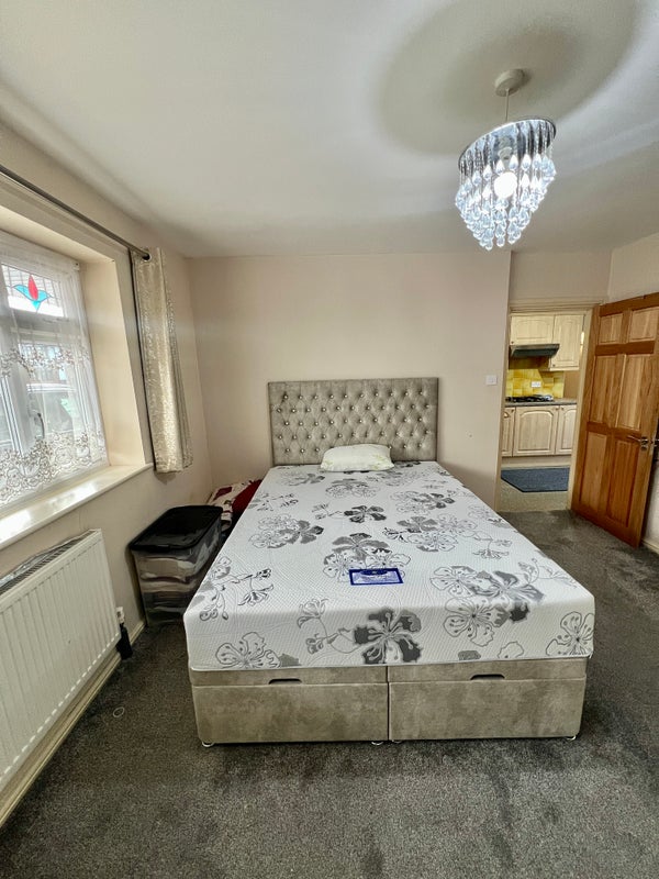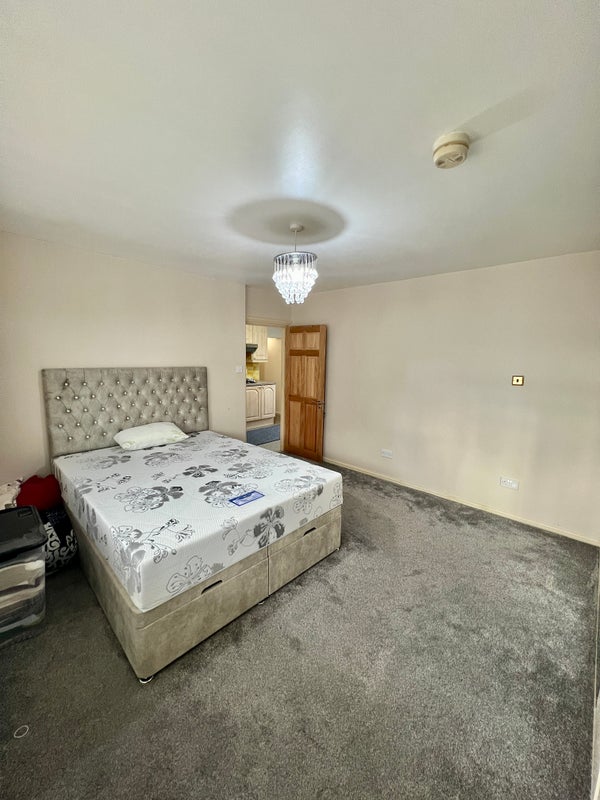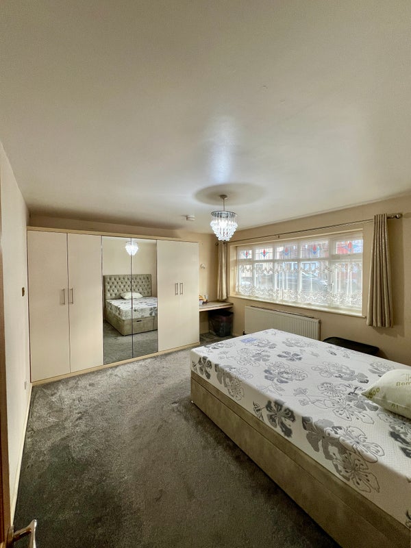 The room is spacious, freshly presented and ready to make your own. It includes a comfortable king-size bed and a large built-in wardrobe that will be completely empty for your use, offering excellent storage space. The room comfortably accommodates the bed along with additional furniture, with soft carpeting and a large window that brings in plenty of natural light.