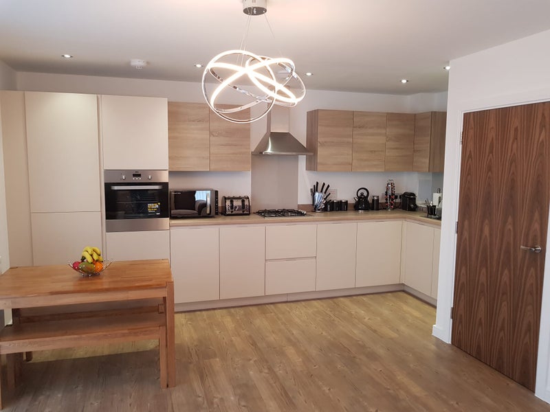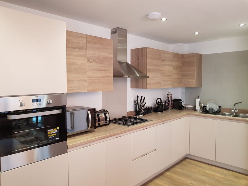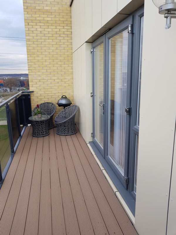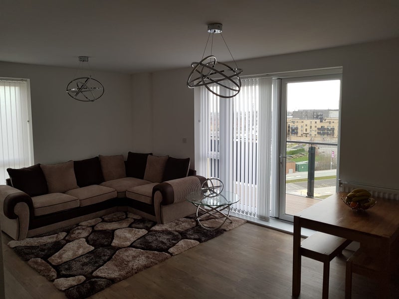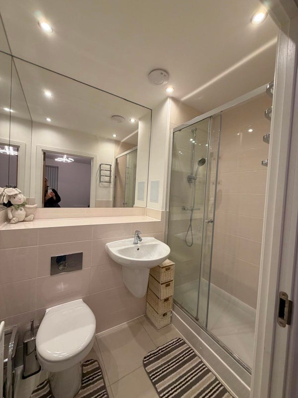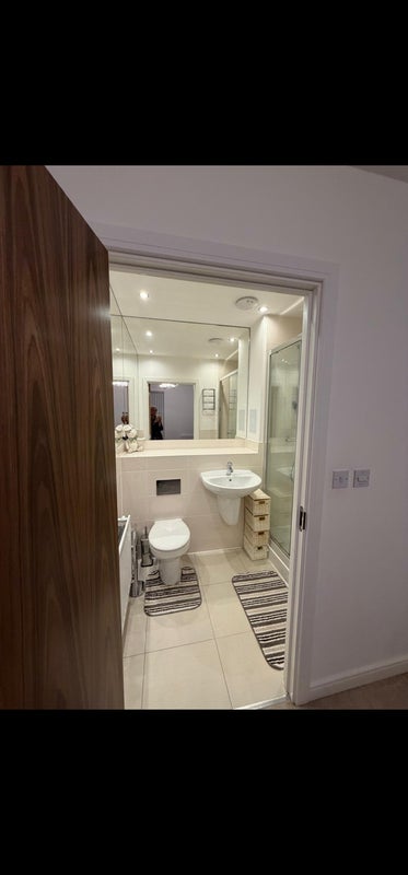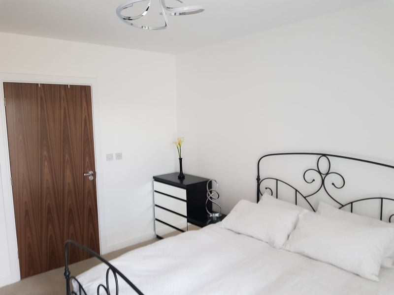 The ensuite room is available in a modern, well-kept two-bedroom apartment at Barking Riverside, right next to the Rivergate Centre.