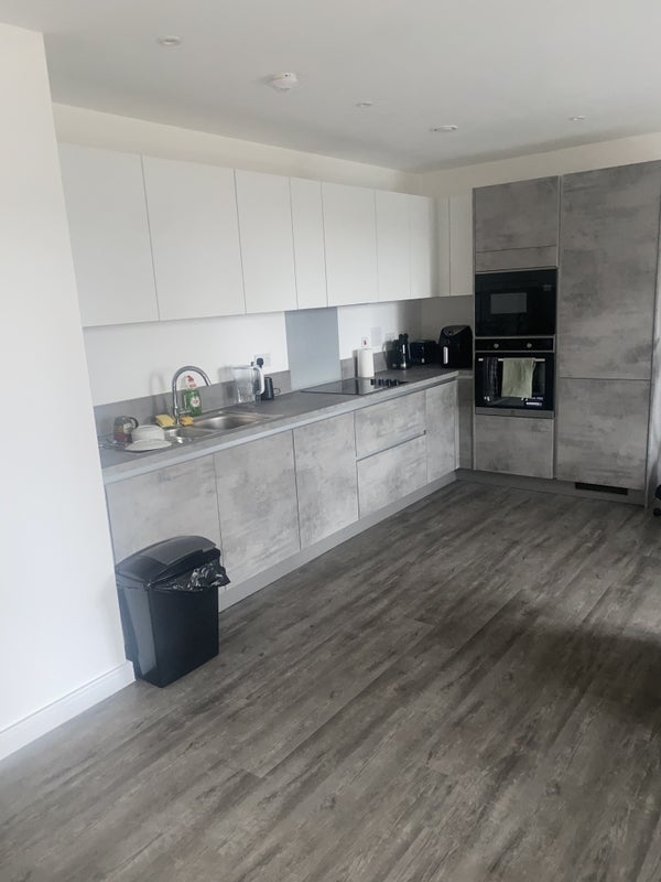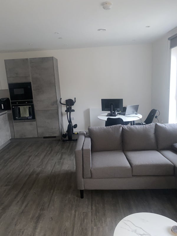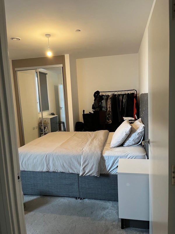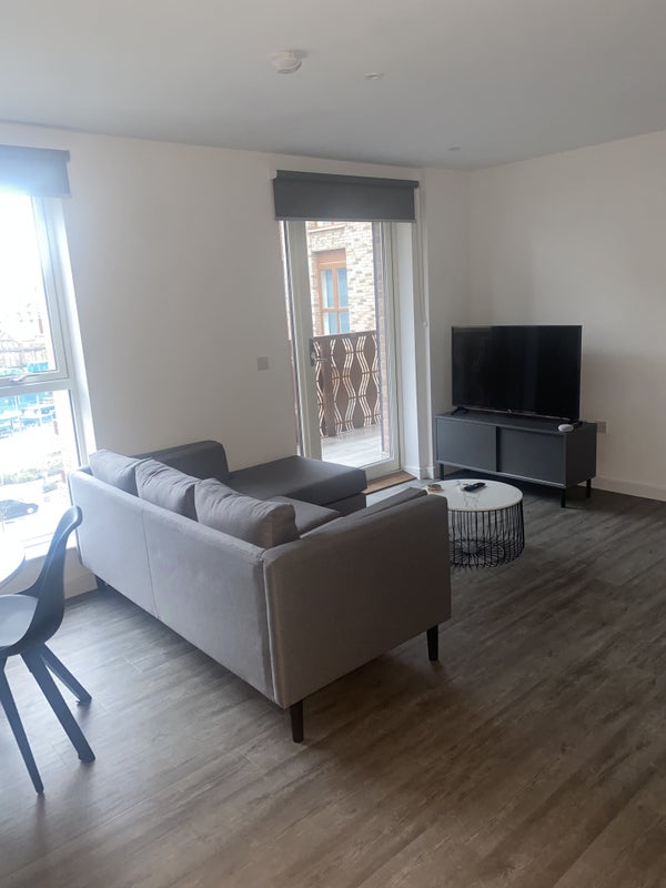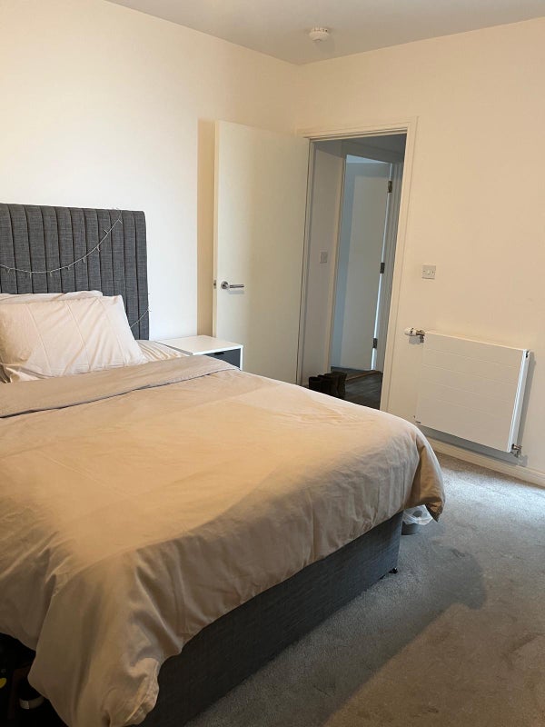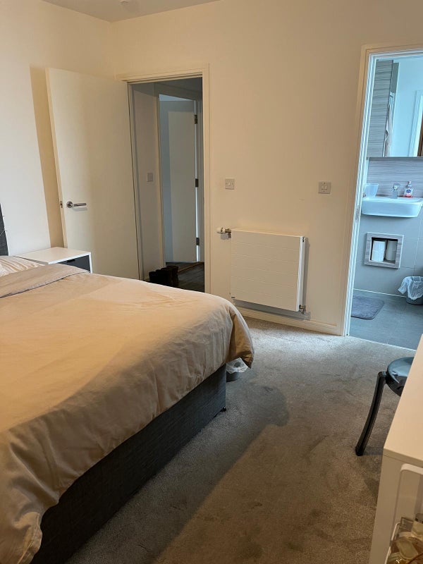 A modern double room with private ensuite is available in a recently built two-bedroom property. The room includes built-in wardrobes and a clean, contemporary finish. The property features a shared living room, a large balcony, and access to building facilities including a gym, communal areas and a dedicated work-from-home space. Suitable for a single occupant or working professional seeking a well-kept and comfortable home.