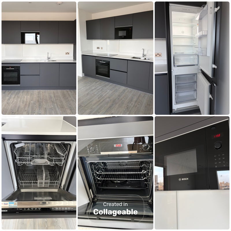 The open-plan kitchen, dining and living area is a bright, welcoming space, thoughtfully designed with large windows drawing in natural light and direct access onto the private balcony. The kitchen features modern matt handleless units, Caesarstone worktops, LED under-cabinet feature lighting and a stainless-steel splashback. This home is complimented by premium finishes such as integrated Bosch appliances such as the induction hob, oven, microwave, dishwasher and fridge/freezer, with soft-close drawers and cupboards.