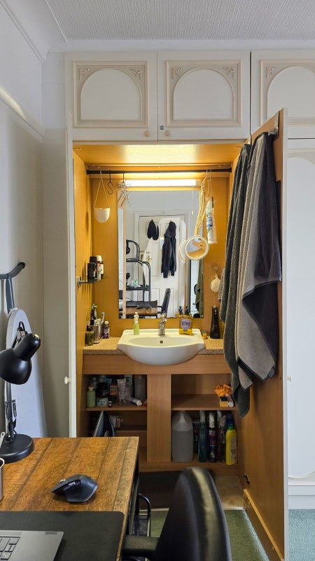 The room also has its own handbasin and mirror/vanity unit which is discreetly hidden in the end cupboard.