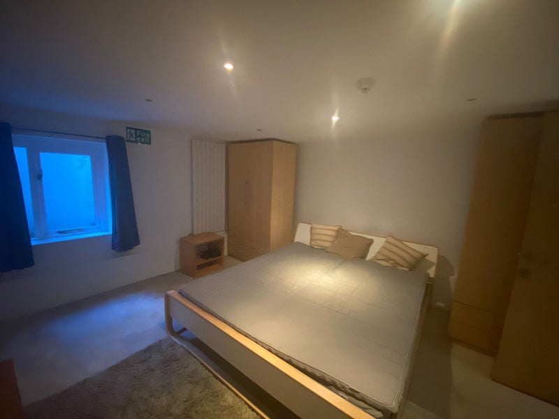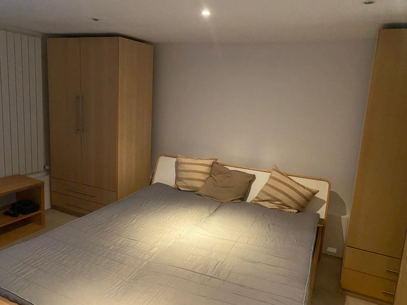 SHORT LET- A private en-suite room is available in a spacious basement of a shared house in Brentford, West London. The room includes a king size bed, king-size mattress, office space, and sofa. The en-suite bathroom has a bathtub and a shower for relaxation and convenience.