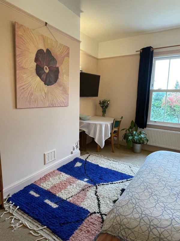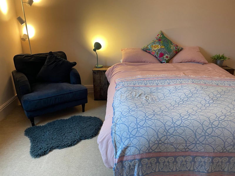 The bedroom in our first-floor flat is for single occupancy and has a lovely king-sized bed with Simba Mattress. The kitchen and newly refurbished bathroom are shared - for most part of the time with only one person. There’s no living room but there’s a comfy armchair and dining table/ desk in the bedroom and you can eat in the kitchen if you fancy.