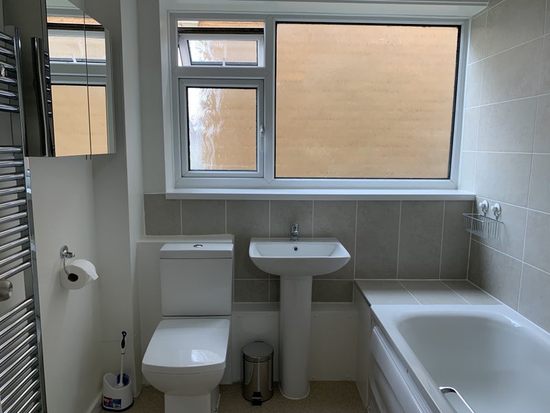 Kitchen with all fittings and appliances, upstairs bathroom and downstairs shower. Two toilets and basins. Separate dining room with TV. Free residential parking, front and back garden. Quiet residential area.