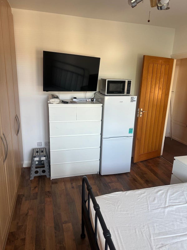 Room amenities: Fridge-freezer, microwave, large chest of drawers & wall-mounted TV.