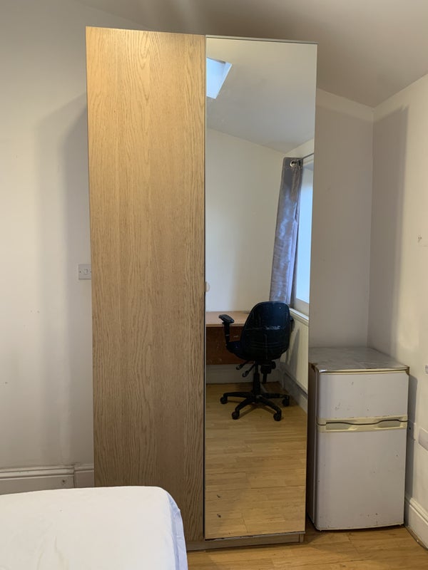Room has double bed, double wardrobe, desk. Chair and small fridge freezer.