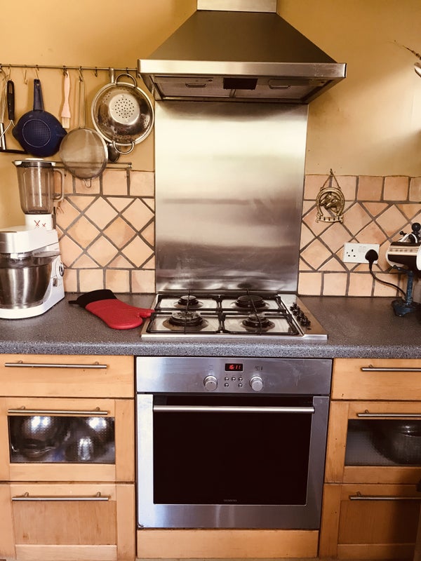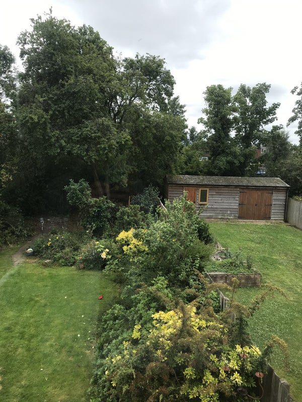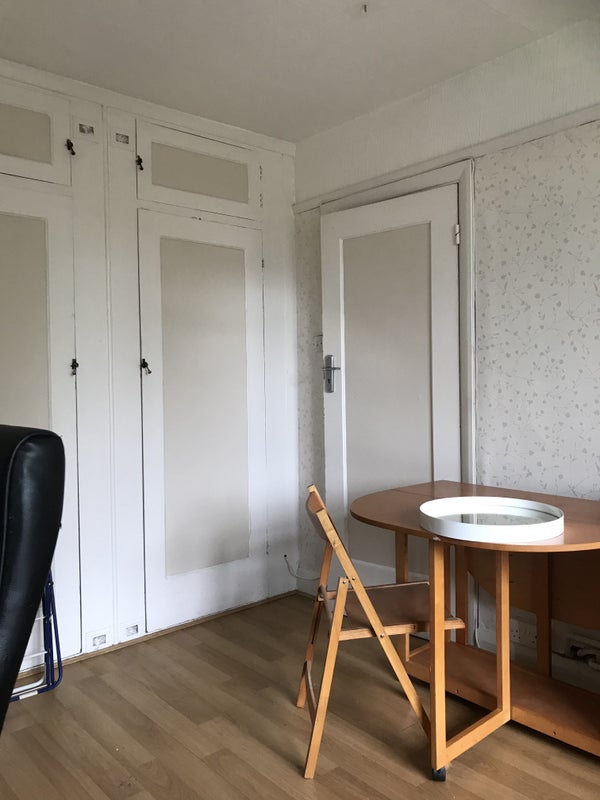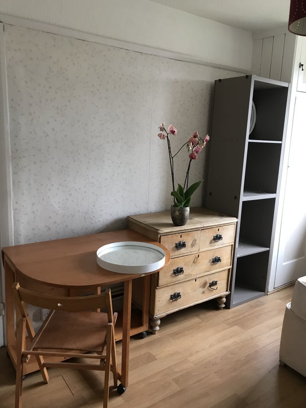 Fitted wardrobe, chest of draws, tall slim shelf unit, Fold out table and chair, double bed, Wooden floor. Over looking the garden.