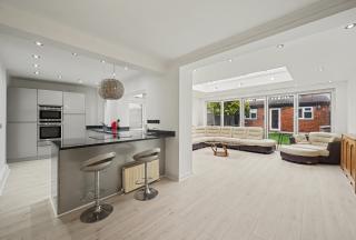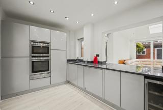 Finished to an exceptional standard throughout, the ground floor offers s spacious front reception room, a separate home office, and a convenient guest WC. To the rear, a stunning fully fitted open-plan kitchen with integrated appliances, including a built-in wine cooler, flows generously into a generous reception/dining area, creating the perfect space for modern family living and entertaining.
