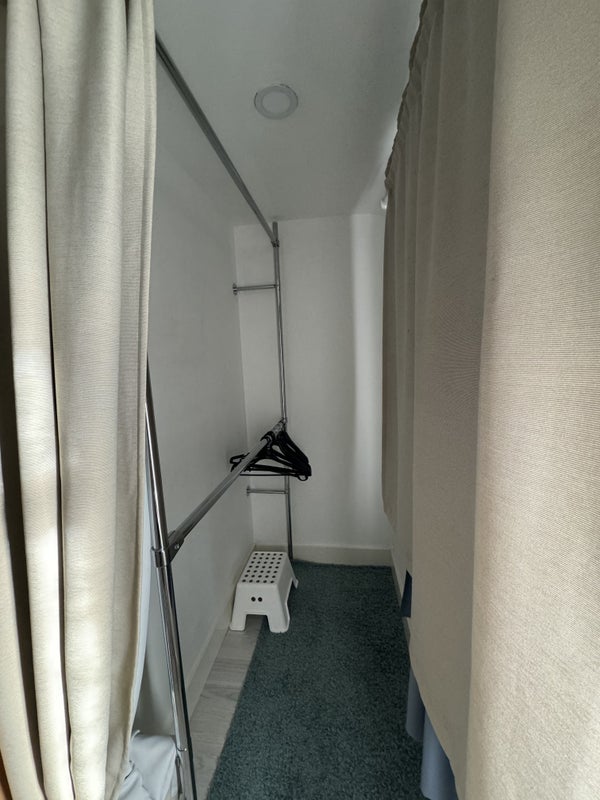 The room has a walk-in closet, two chest of drawers, a desk and a comfortable double bed with four large drawers underneath for additional storage.