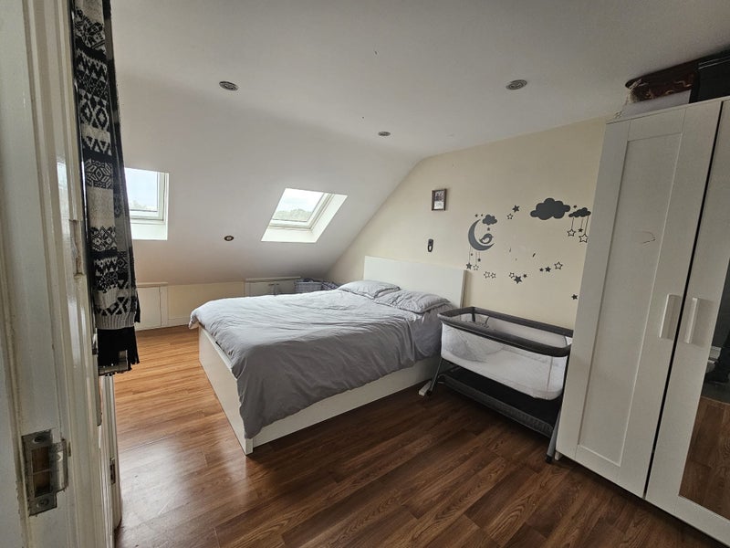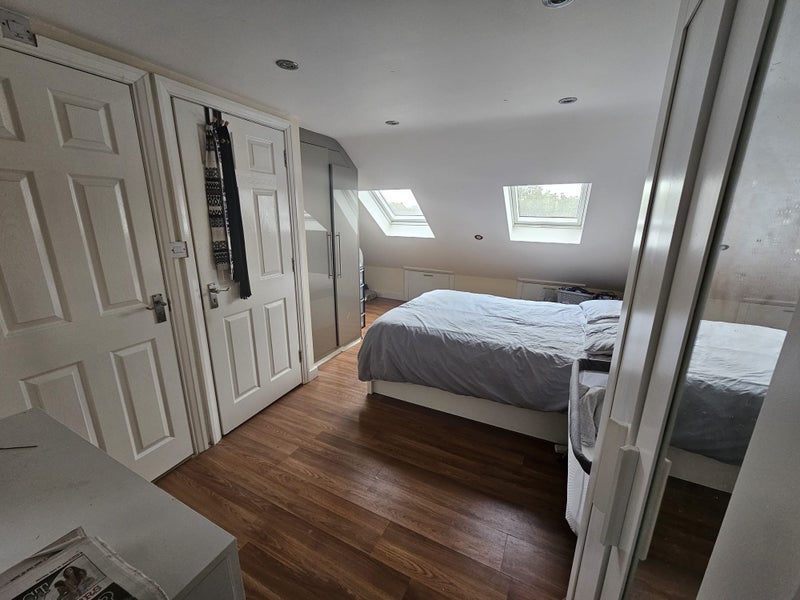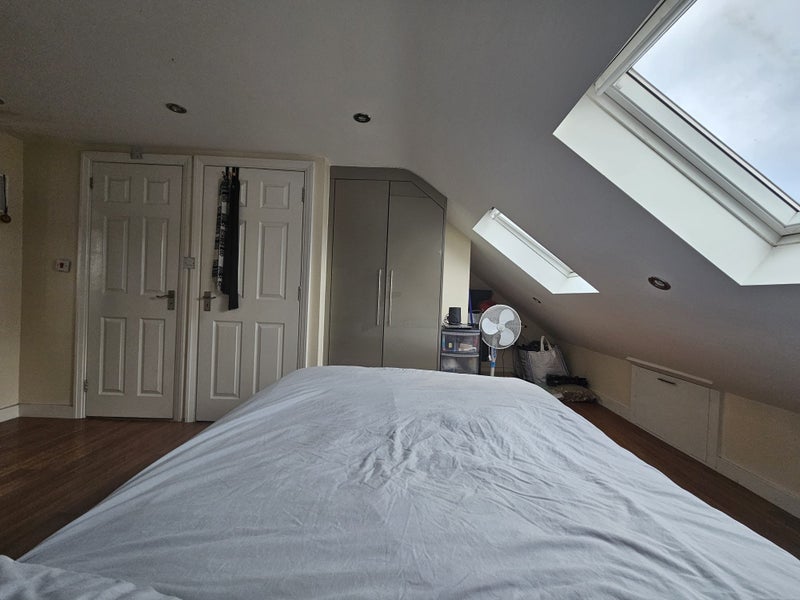 A beautifully presented loft double room with a private attached bathroom, offering comfort, privacy, and plenty of natural light from two skylight windows.