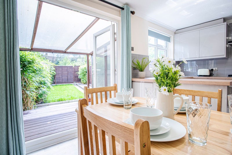 ✅ Fully equipped kitchen with dining room and living area looking out on to garden