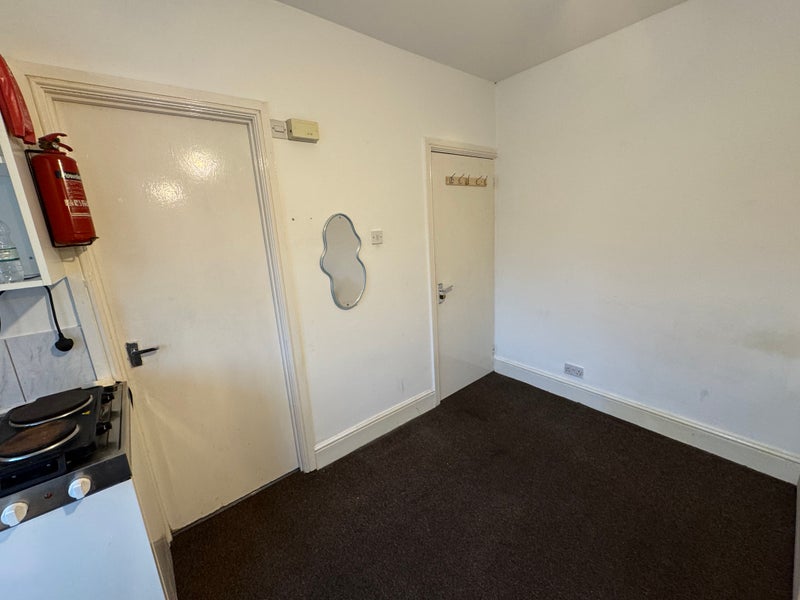 Self-contained, part furnished studio with en-suite bathroom, kitchenette, bed.