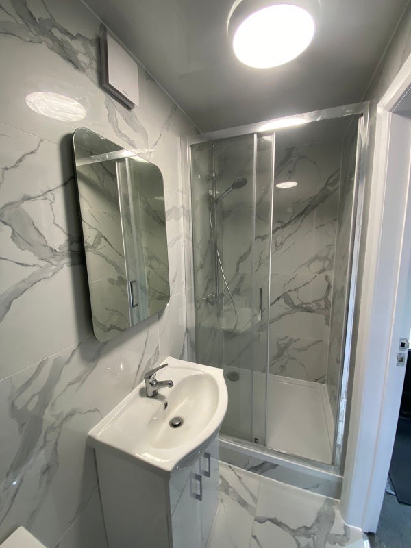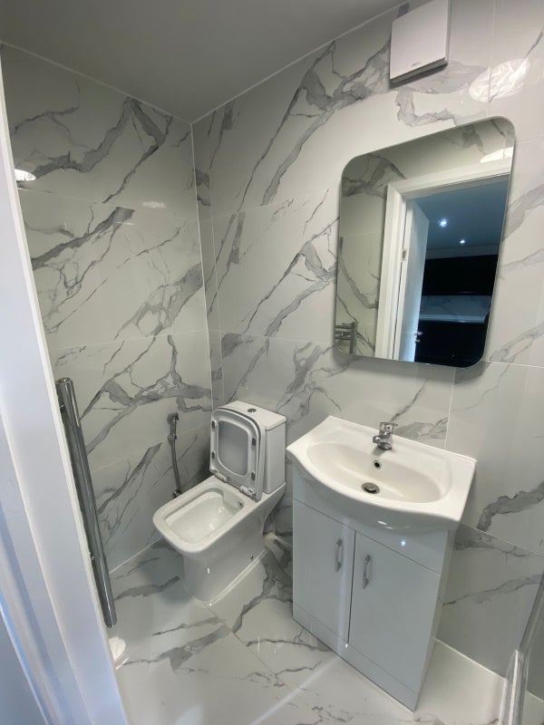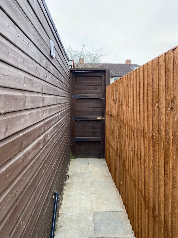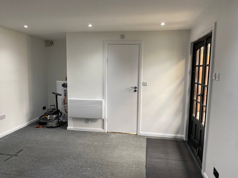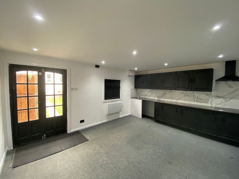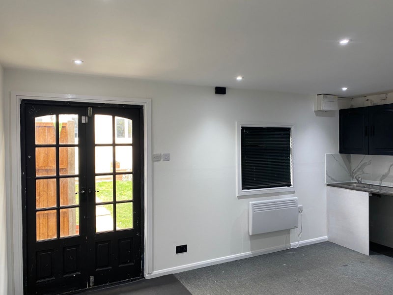 Newly built annex studio flat available for rent, located at the back of a home with a separate private entrance. The unit includes a private bathroom, kitchen, washing machine, double bed, fridge, cupboard, heating, and access to a private garden.