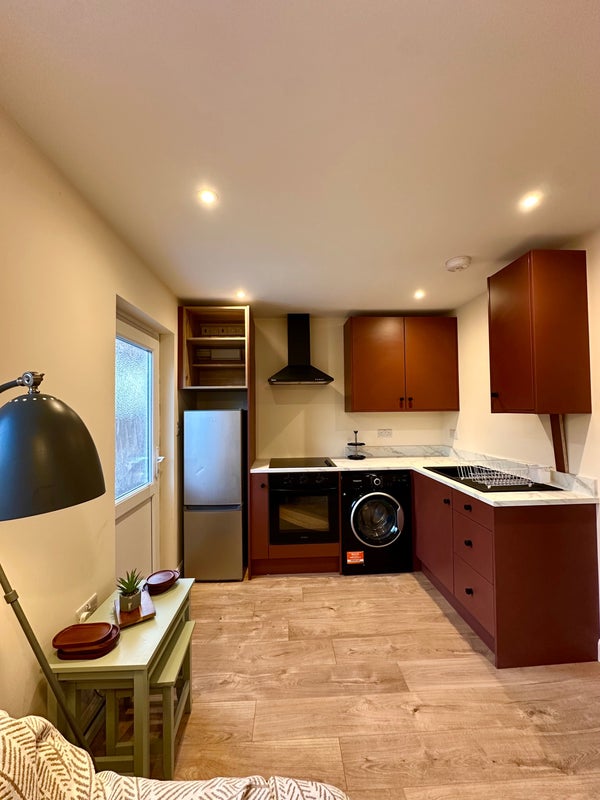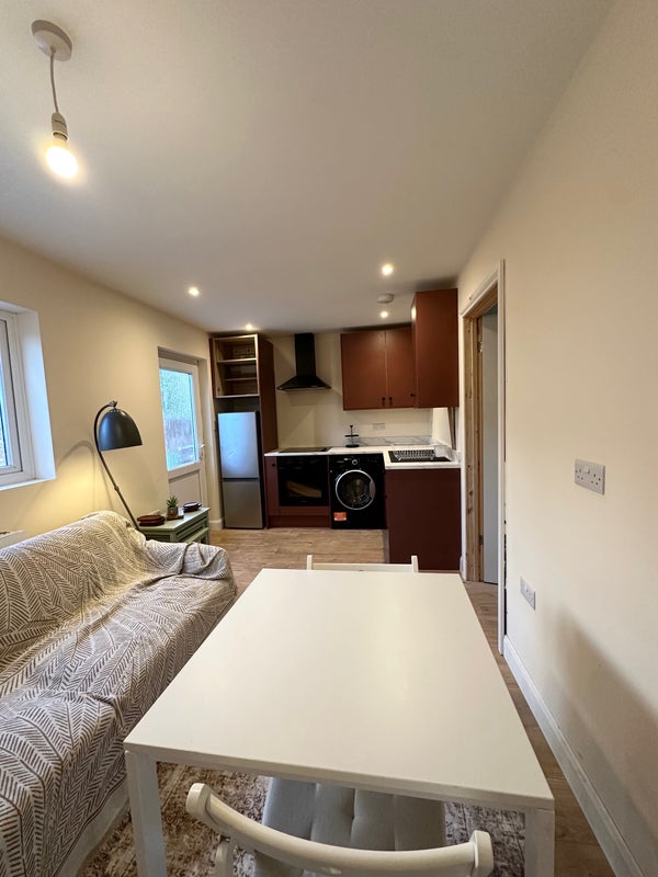 - Studio includes a bespoke kitchen, living area, double bedroom and bathroom.