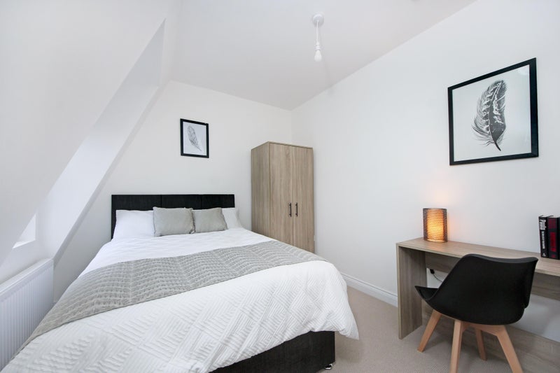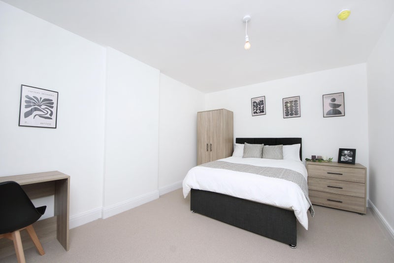 Fully furnished with a double bed (high-quality mattress + storage drawers) and wardrobe.