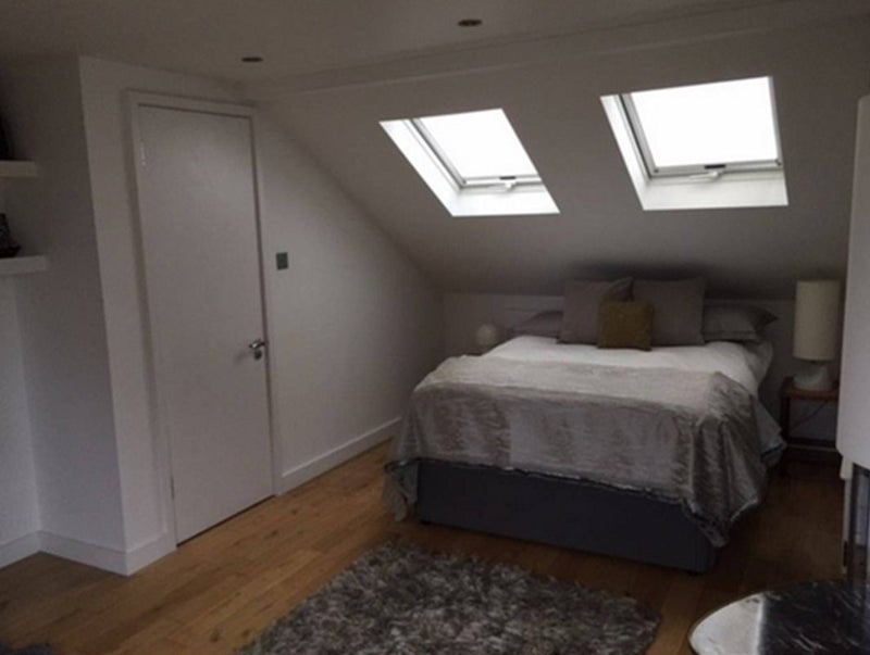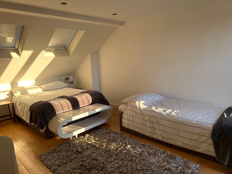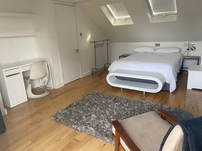 large modern double bedroom with en-suite in loft conversion in re-furbished Victorian house. Beautiful view of garden from glass doors, (which open up , beautiful sunsets. Room cleaned once per week incl bedlinen. Well insulated, top floor quiet room.