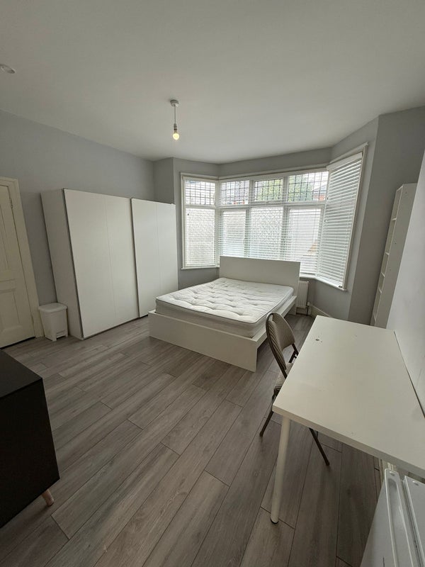 Large street-facing double bedroom with private en-suite available in a clean, well-maintained shared house in Harrow. The room is bright and spacious with large windows and is fully furnished with a double bed, wardrobe and desk.