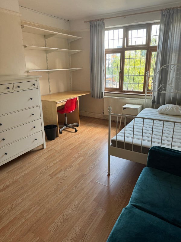 1st floor rear room. Large windows overlooking garden. Bright and sunny Beautifully decorated. Double bed, wardrobe, desk, chair, chest of drawers, sofa, £800 includes all bills and cleaning fee. Available now.