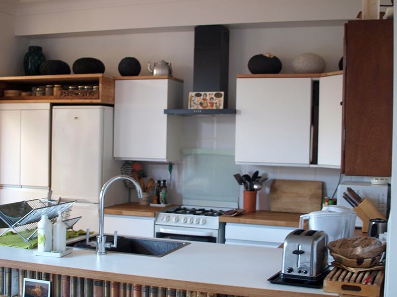 * Stylish open plan kitchen/living room overlooking the garden with washing machine, gas cooker, oven and grill, microwave and classic electric oven, large sink, storage space for you and share of tableware, kitchenware.