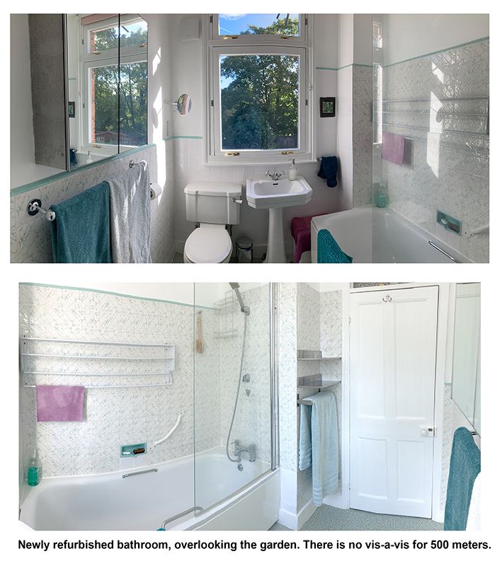 * One newly refurbished bathroom with WC, bath/shower, washbasin, cupboards, linoleum, large foldable laundry rack, effective extractor fan, overlooking the garden. No vis a vis.
