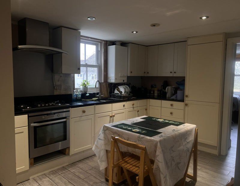 It’s a 2-bed studio flat. One bathroom and a kitchen are to be shared.