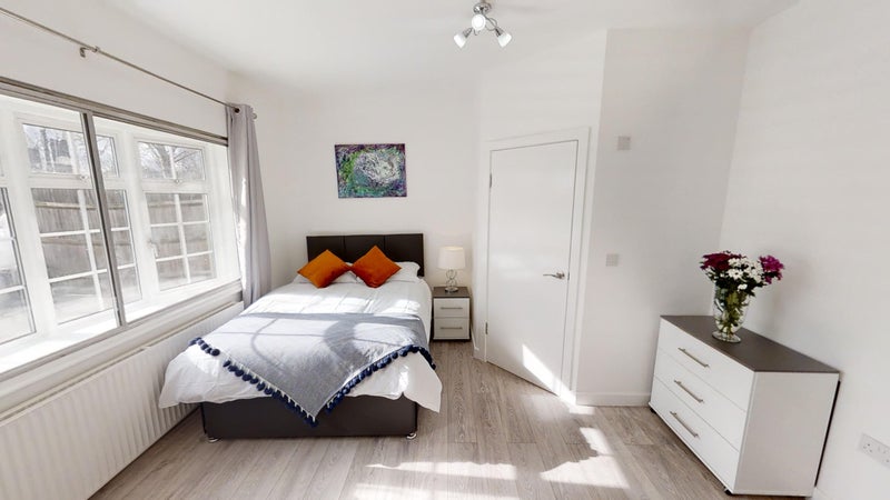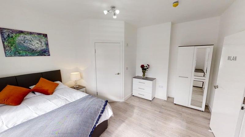 Ensuite room comes fully furnished with double bed, brand new semi-orthopaedic mattress, wardrobe, desk, bedside table, lamp, chest of drawers and bedding.