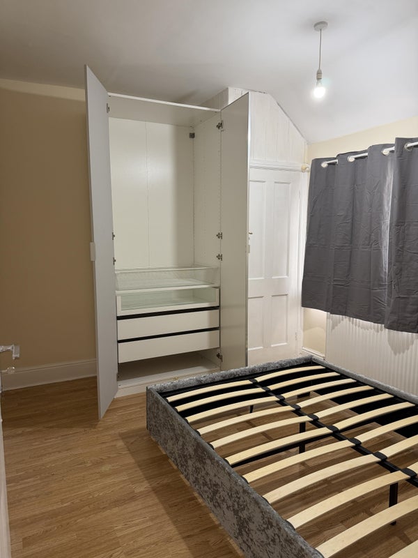 Hii we are offering a double room with double new storage bed and two wardrobes. Kitchen is shared. Garden and garage is also there. There is sufficient space for parking also.