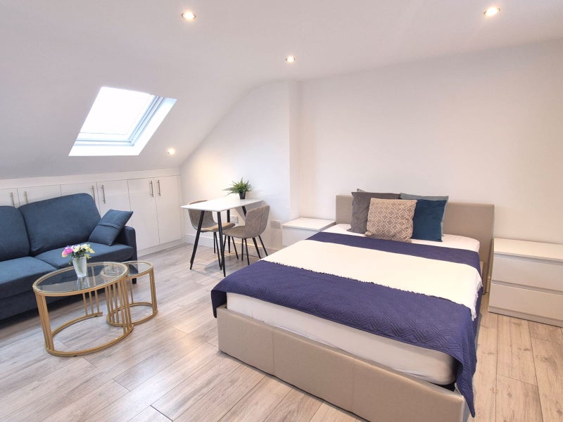 The studio is completely furnished and decorated: large wardrobes, chest of drawers, comfortable ottoman beds with extra storage, desks and chairs.