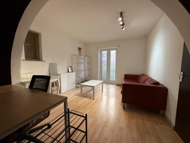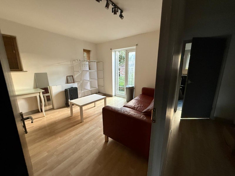 This spacious double room comes with its own furnished living room, featuring French doors that open to the back garden. The bedroom includes a king-size bed, wardrobe, and side tables.