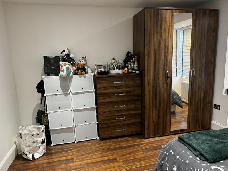 • Triple mirrored wardrobe, chest of drawers, and bedside table