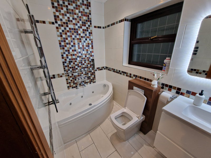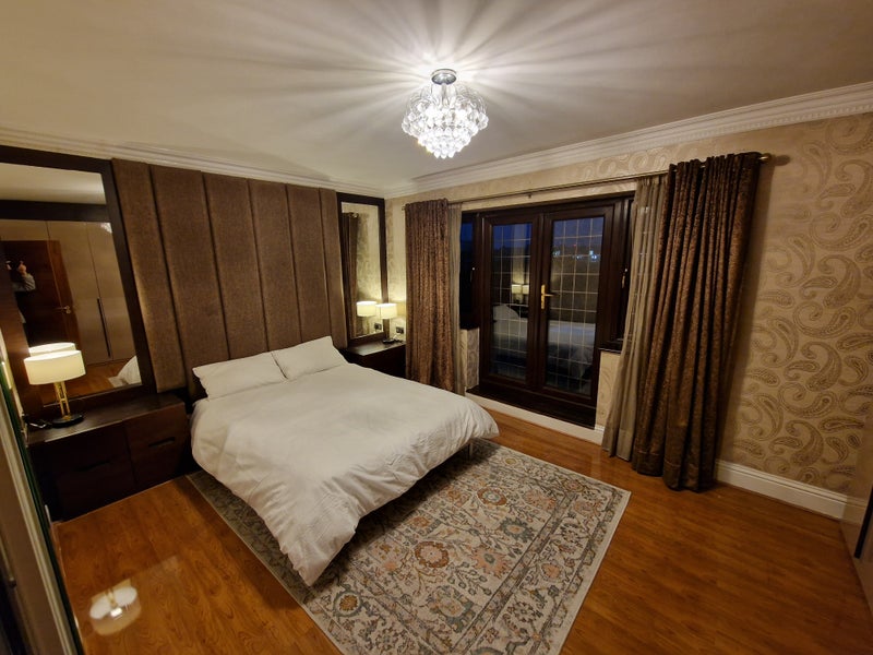 Large double room with king bed and fitted wardrobes. Wooden floor. Walk in closet and private bathroom. The bathroom consists of WC, shower and bath with Jacuzzi. All bills included.
