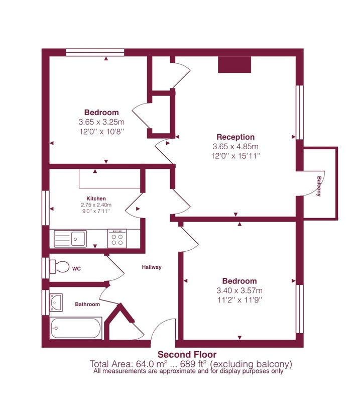 The property features a spacious reception room with access to a private balcony, a separate fitted kitchen, two goodsized bedrooms, and a bathroom with separate WC. The layout provides a practical and comfortable living arrangement, ideal for professionals, couples, or small families.