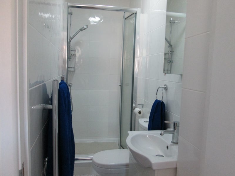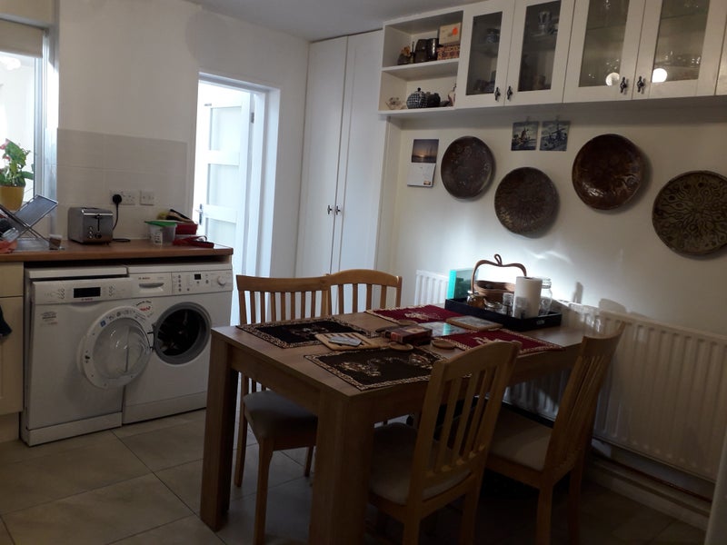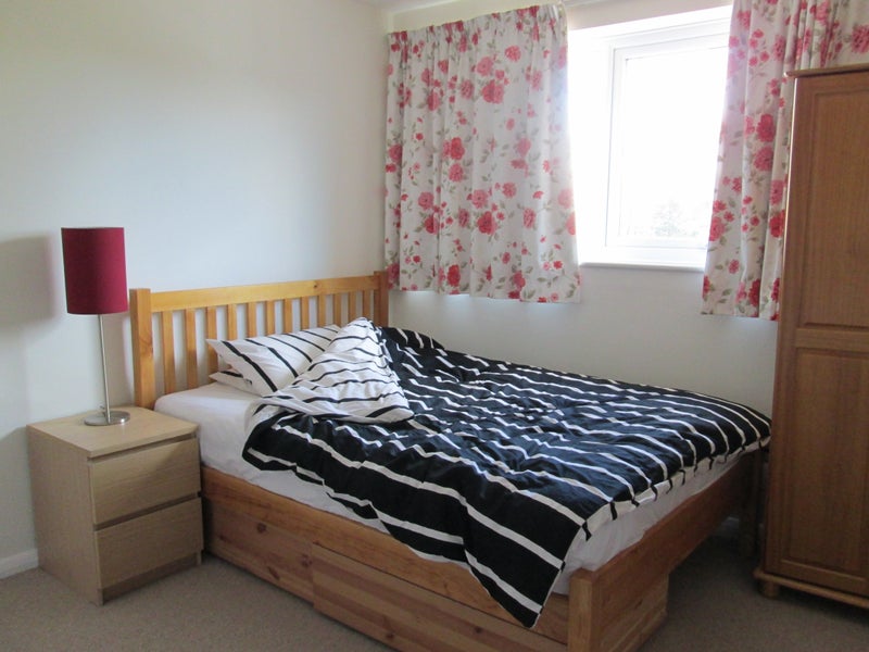 It is a very comfortable double room with en-suite that has a power shower. The room is on the second floor of a modern, well maintained town house. The design of the ensuite is compact. I'm looking for one person only, no couples. The room is furnished, has lots of plugs, black out lining to the curtains.. Bedding and towels provided, and washed. The room is cleaned once a week. There's one other lodger with whom you will share a fridge and freezer drawer. We share the kitchen, snug t. v. room, and garden. Main lounge not shared but welcome to come and pet the dog.