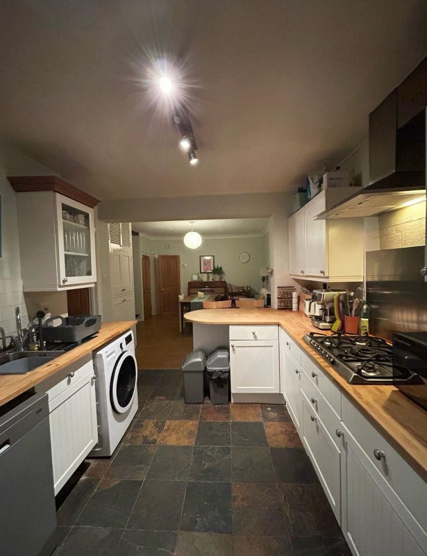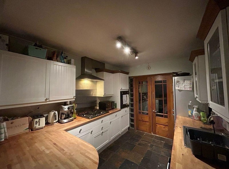 • Kitchen with large dining area, also space for a desk including spacious cupboard with a rail and shelf