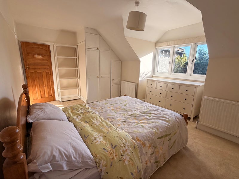 The room features a king-size bed with a new mattress, new carpet, large fitted wardrobe, separate bookcase & large chest of drawers.
