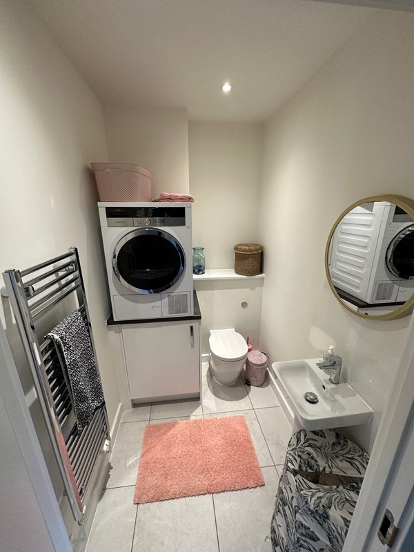 Small Double- private bathroom- Ground Floor- Double loft bed with mattress, drawers, chair, desk and wardrobe with full length mirror. Floor to ceiling window with privacy glass and full length blind within this 3 storey town newbuild home located on a quiet private new build development on the canal with a large green space walking distance from the Elizabeth Line Station.