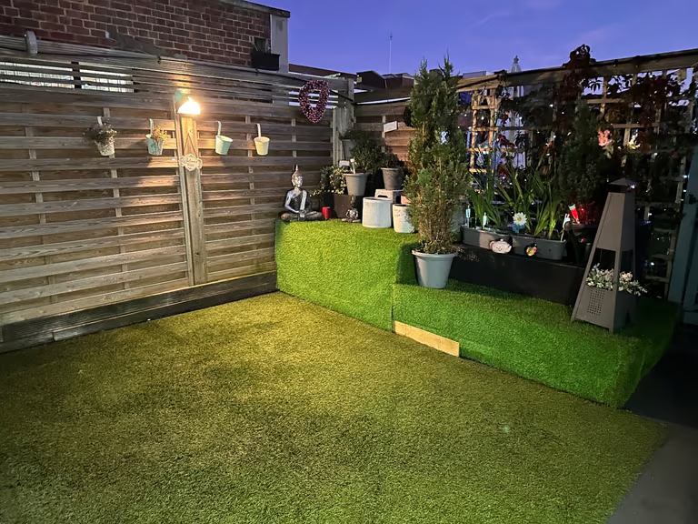 Lovely Garden with Astro turf, garden table & chairs, BBQ, plants, and lights