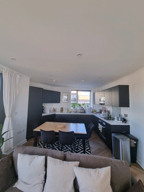 The modern kitchen comes fully equipped with integrated appliances, including a fridge/freezer, dishwasher, oven, and microwave, and offers plenty of storage. The living room is bright and spacious, providing a comfortable and welcoming living space.